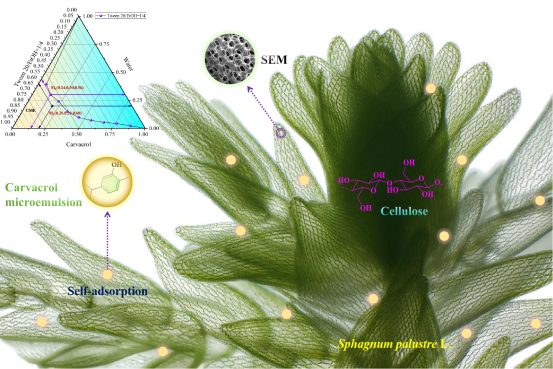 该研究创新性地以天然苔藓植物泥炭藓(Sphagnum palustre L.)作为多孔载体材料,利用其优异的自吸附性能负载香芹酚微乳液,构建了一种新型缓释保鲜体系。该材料可实现香芹酚的持续释放,有效抑制芒果采后病原菌生长,显著延缓果实腐烂;同时,其多孔结构还能增强果实抗机械损伤能力。该体系兼具天然、安全、高效的特点,为芒果等水果的绿色可持续保鲜提供了新策略,具有良好的应用潜力。