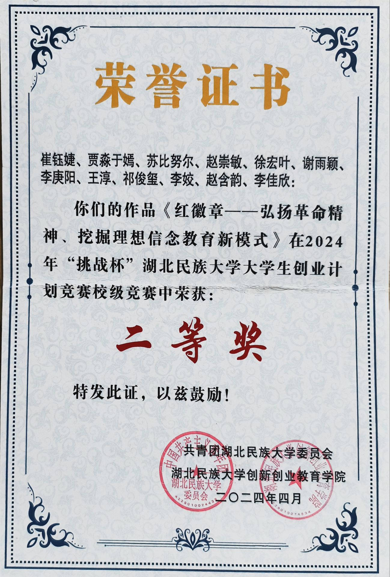 崔钰婕,湖北民族大学法学院学生,“红徽章”项目核心成员,国家奖学金获得者,校史馆优秀讲解员,曾受邀至湖北恩施学院团校分享双创经验。斩获中国国际大学生创新大赛国赛铜奖一枚、湖北省金奖两枚、“挑战杯”湖北省铜奖一枚、获得湖北省“百生讲坛”优秀主讲人等多项荣誉。其参与的创新创业项目成果显著,在实践中得到有效推广。