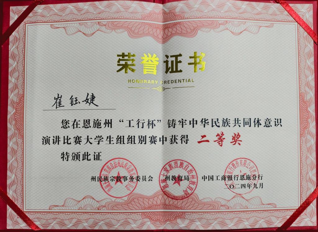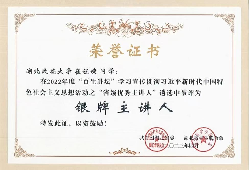此外,出于对语言艺术与思想传播的热爱,她从“百生讲坛”出发,先后在“道中华杯”民族院校大学生演讲比赛中取得佳绩,获评湖北省“百生讲坛”优秀主讲人,并被授予“道中华青年推广人”称号。2024年,她受邀至恩施学院团校授课,将双创经验分享给更多青年学子。