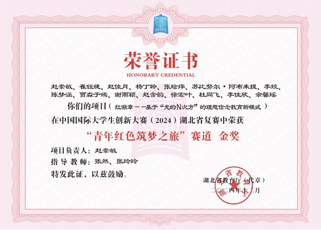 作为“红徽章”项目负责人之一,她自加入以来便全力推动理想信念教育的创新传播。该项目自2019年成立后,从宣讲革命英雄张富清的事迹起步,逐步拓展至打造民族歌舞剧并赴武汉、北京展演,进而设计革命军人IP、开展“红色+绿色”助农直播,并开创“光的N次方”公益服务新模式,实现了红色文化多元化与年轻化的表达。依托出色的演讲、主持与组织能力,她带领团队实现成绩跨越,从2023年获湖北省银奖,到如今接连斩获省级金奖与国家级铜奖,用一份沉甸甸的国字号奖项,为他们的奋斗历程作出了最有力的注解。