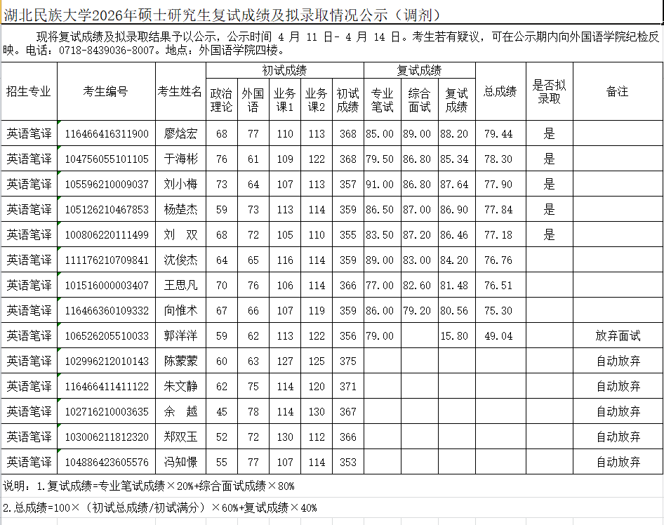 湖北民族大学2026年硕士研究生复试成绩及拟录取情况公示(调剂)