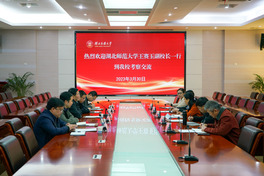 在行政楼三号会议室举行的座谈会上,邓磊代表学校对王赛玉一行表示热烈欢迎。他简要介绍了我校评估后的基本情况,重点围绕“一跨越”和“三提升”两个方面,介绍了学校在内涵建设水平、基础设施条件、现代化治理能力等方面取得的成绩。王赛玉高度肯定了我校近年来的发展,表示湖北民族大学和湖北师范大学所面临的发展环境、奋斗的目标具有相似性,邀请我校前去参加湖北师范大学五十年校庆,希望两校进一步加强交流与合作,携手进步。双方与会人员围绕申请博士授予点、教师教育专业建设、科研发展与管理、信息化建设等进行了深入交流。