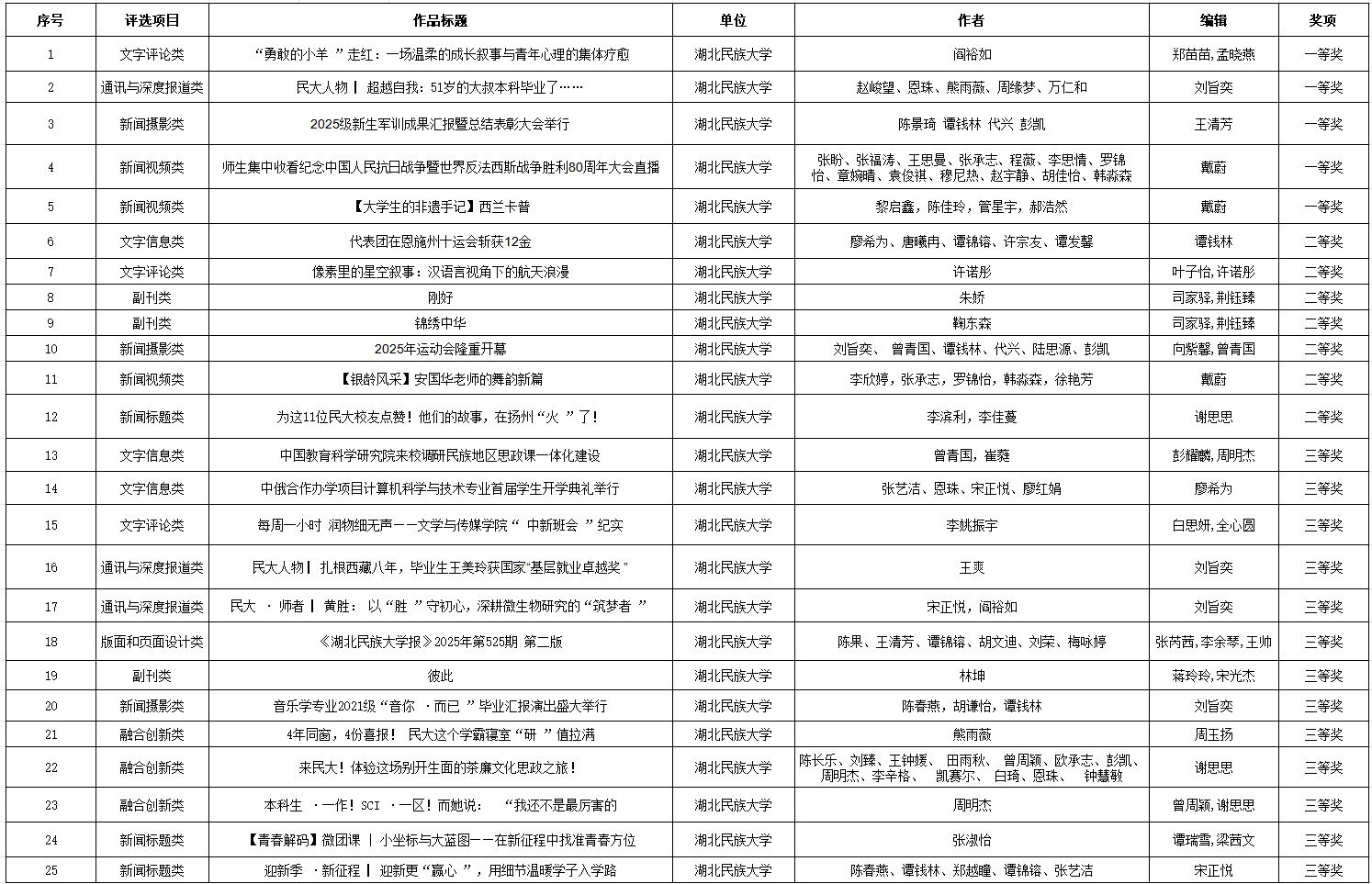 2025年度湖北高校新闻奖湖北民族大学获奖名单
