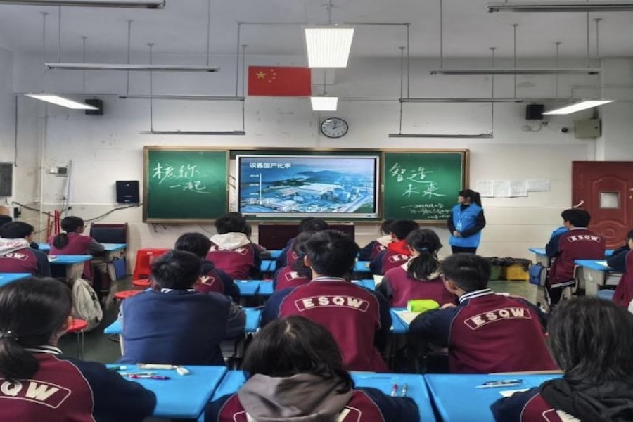宣讲员武兰琦通过播放《中国核工业70年》视频短片,带领学生回顾中国核工业发展的辉煌历程,并围绕《探索核电站》和《智慧核工业》两大核心内容展开。讲解《探索核电站》时,武兰琦以PPT演示、视频动画结合的形式,系统阐述核能基本原理,解析核电站的安全保障与环保措施,重点讲述中国核电成就,深度解读“华龙一号”等大国重器背后的技术突破与奋斗故事,让学生对核电技术的专业性与国家核电事业的发展高度有了直观认知。在《智慧核工业》主题宣讲中,宣讲员李荣谊聚焦数字化核电站建设以及核技术在医疗、农业等领域的广泛应用,通过丰富案例讲解,展现核工业在智慧化发展与多领域融合中的创新图景,帮助学生构建起从核电技术到核工业生态的完整认知框架。