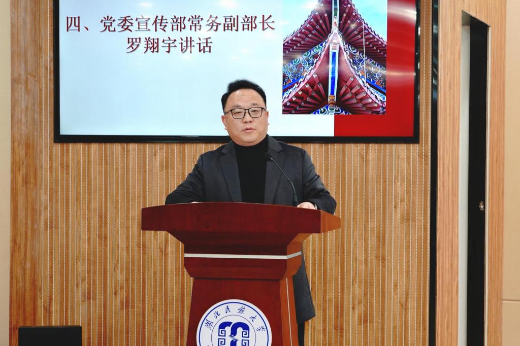 党委宣传部常务副部长罗翔宇出席会议并讲话。他指出,作为学校党委主管主办的宣传阵地,大学生通讯社是民大故事的“讲述者”,也是校园舆论的“风向标”,更是师生员工的“连心桥”。大家责任重大、使命光荣。他希望广大学生记者既要“守阵地”,又要“破圈层”,要在“举旗定向”中提升 思想的“深度”;既要“融媒体”,又要“创精品”,要在“创新提质”中打磨 传播的“锐度”;既要“练脚力”,又要“强脑力”,要在“躬身力行”中涵养成长的“温度”。