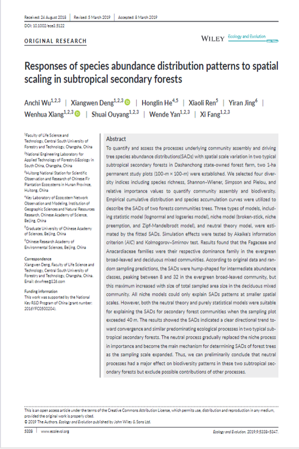 吴安驰以第一作者身份在Ecology and Evolution发表题为Responses of species abundance distribution patterns to spatial scaling in subtropical secondary forests的论文