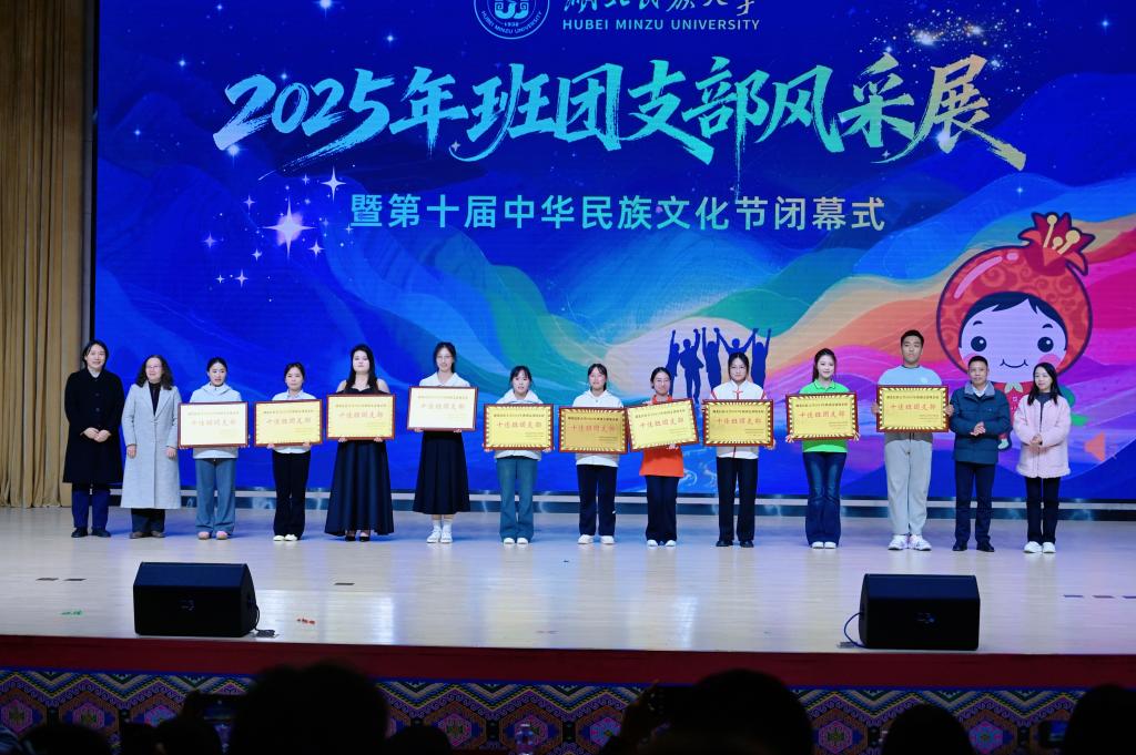 11月28日,由共青团湖北民族大学委员会与学生工作部联合举办的2025年班团支部风采展暨第十届中华民族文化节闭幕式在新区多功能报告厅举行。颁奖现场经过激烈的角逐,医学部0524508支部、外国语学院0823404支部、体育学院0923401支部、数学与统计学院0222405支部、化学与环境工程学院0424406支部、民族学与社会学学院1623401支部、马克思主义学院1224402支部、音乐舞蹈学院1423402支部、教师教育学院1523401支部、法学院1123404...