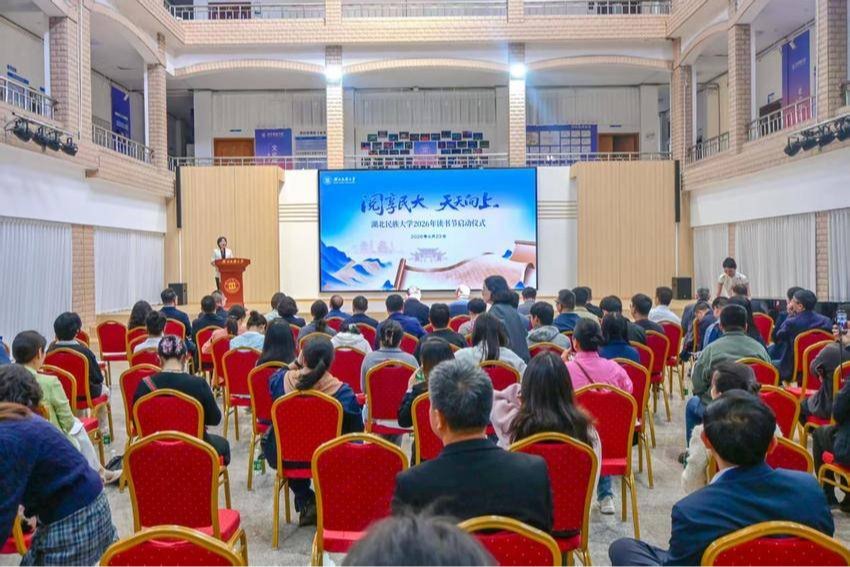• 4月23日,在第31个世界读书日到来之际,湖北民族大学2026年“阅享民大·天天向上”读书节正式启动。启动仪式通过“音舞诗画”的独特艺术形式,与美育思政课“典籍里的恩施”深度融合,带领全校师生及社区群众循着典籍的脉络穿越千年时光,在字里行间探寻文明根脉,共同构筑书香社会。读书节启动仪式现场湖北民族......