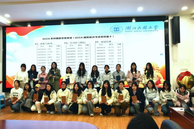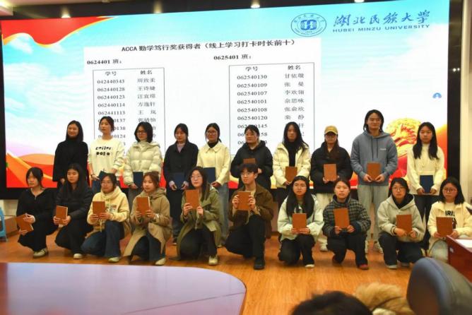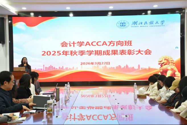 本网讯(记者 佘思咏 刘晨怡/文 张玉珊 彭如妍/图)2026年3月22日,经济与管理学院会计学ACCA方向班2025年秋季学期成果表彰大会在经管楼附303会议室举行。高顿教育湖北省区渠道经理谢晖,高顿教育高校事业部华中区运营胡伊宁,湖北民族大学教务处副处长朱廷辉,经济与管理学院党委书记陈霞,副院长冉瑞恩,会计学系主任刘洁玫以及2024、2025级ACCA方向班全体学生参与本次活动。会计学系副主任张尊担任本次活动主持人。