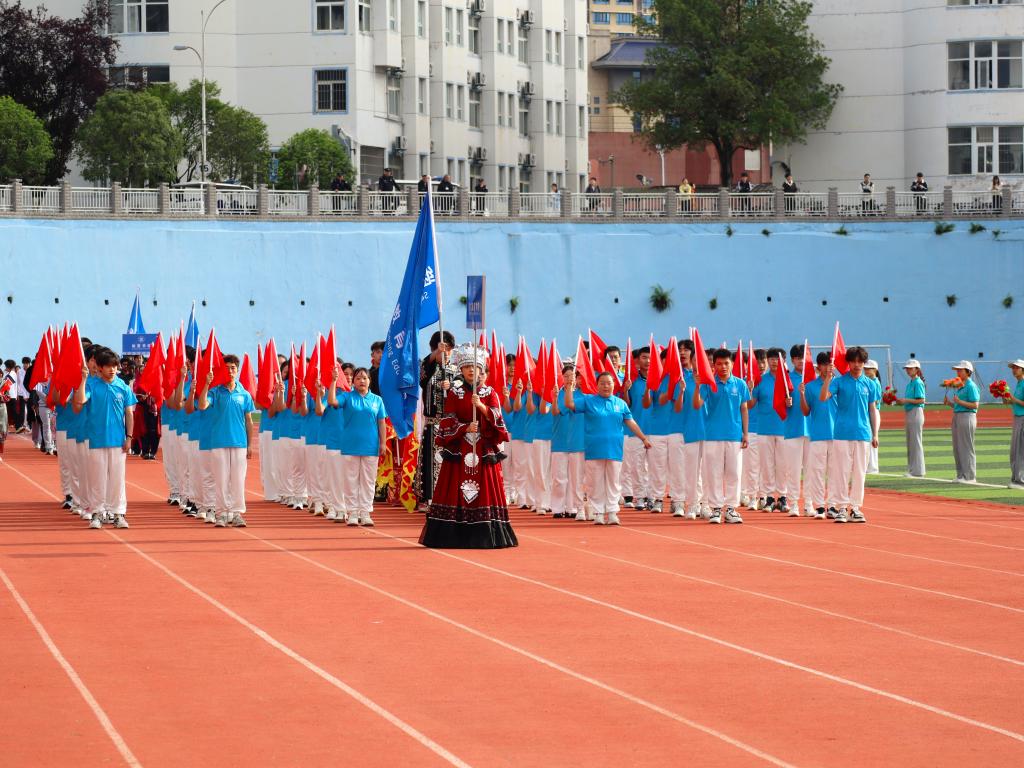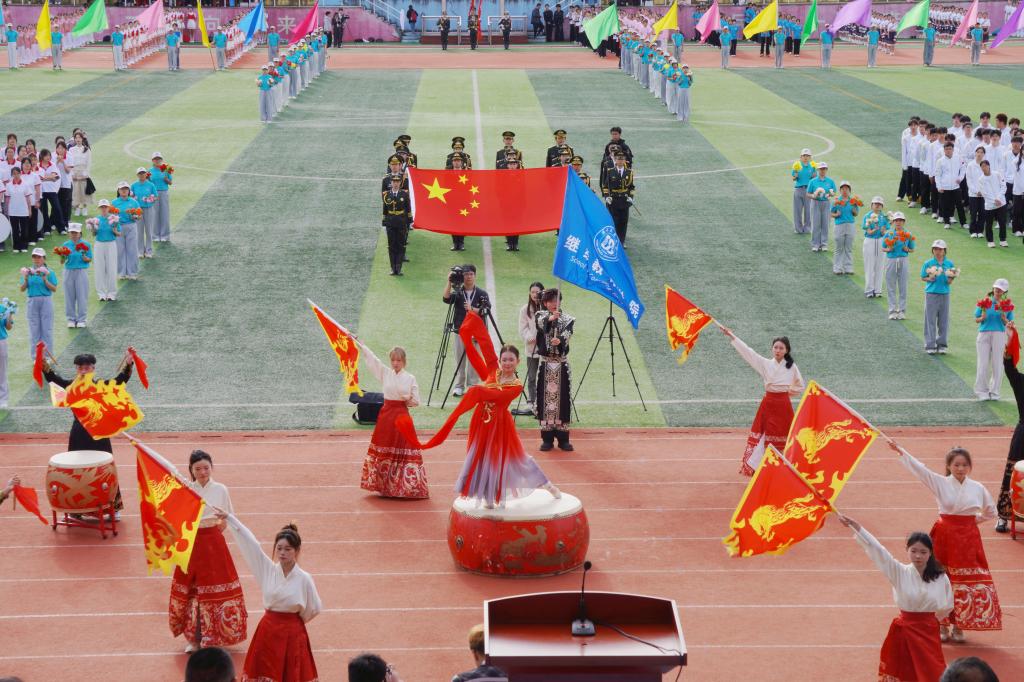 开幕式中,方阵队伍步伐铿锵、气势昂扬,整齐走过主席台;展演环节中,鼓点声与飞扬的彩旗交相辉映,鼓点时而急促如万马奔腾,展现了学子们勇往直前的冲劲;时而舒缓似春风拂面,传递出对运动精神的温柔诠释。水袖舞舞者在鼓上起舞,如彩虹般绚烂,与鼓点的力量感形成刚柔并济的视觉效果。充分展现了我院学子积极进取、团结协作的精神风貌,也为整个开幕式增添了一抹独特而亮丽的色彩。