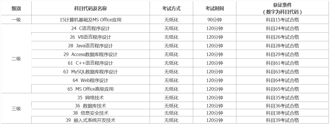 2、自2018年3月起改变三级获证条件要求,考生只需通过三级考试即可获得该三级科目的合格证(详见《考试科目设置及获证条件》),不再要求二级证书。