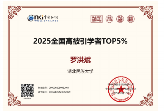 近日,中国知网2025年度“全国高被引学者”榜单正式发布,湖北民族大学图书馆馆长罗洪斌教授入选“全国高被引学者TOP5%”,并获得相应荣誉证书。