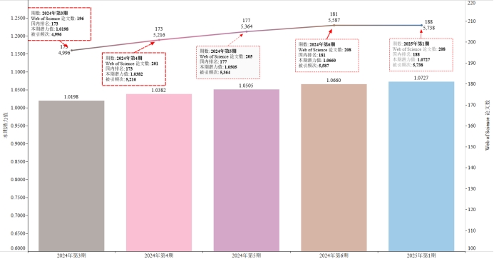 为了计算我校各学科与ESI 1%学科的差距,基于ESI提供的学科阈值和InCites提供的学科被引频次,给出被引量的相对位置的计算公式。在近似的时间下,被引量的相对位置=该学科的被引次数/入选该学科的阈值。(阈值指进入ESI某学科排名前1%的最后一名机构的被引频次)。由于选取InCites 数据集(InCites 数据集更新于20241212日。包含 Web of Science 标引内容 20241130日)晚于ESI数据涵盖数据范围20241031日,实际发文量和引用量略有增加,会导致潜力值比实际略微偏高。因此,通过计算尽管Computer Science 计算机科学潜力值为1.0727大于1,尚未进入ESI学科前1%,但是为我校下一个入围潜力学科。