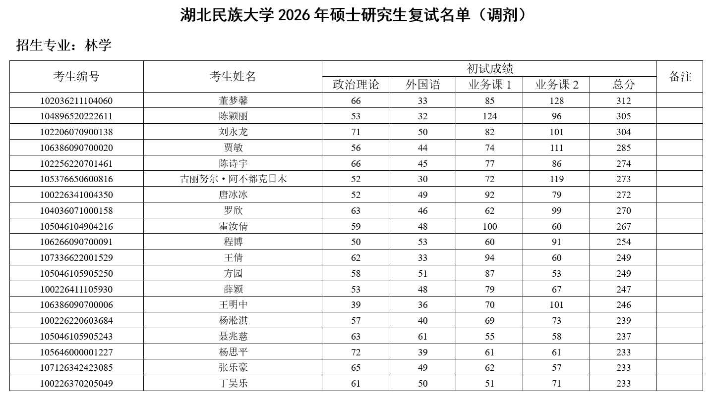林学园艺学院2026年硕士研究生招生调剂复试名单
