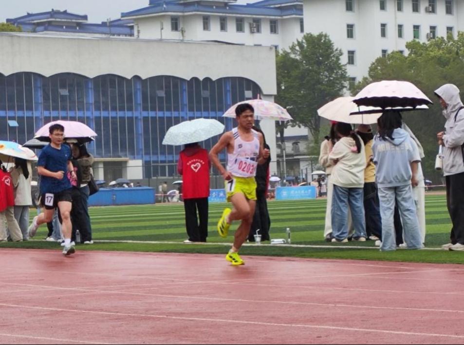 4月22日下午,校运会男子5000米决赛鸣枪开。数学与统计学院大四学子汪宇浩顶住阴雨天气、沉着冲刺,以惊人成绩打破该项赛事保持三十余年的校运会纪录,用一场历史性突破,为学院续写荣光,为自己大学运动生涯画上圆满句号。
