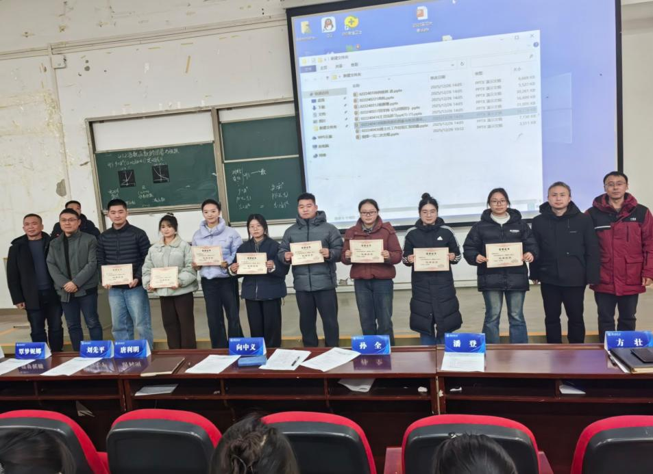 会议伊始,由八位优秀实习生代表分三个主题依次上台,围绕实习期间的经历与思考进行分享。向桂林、杨雅珊、胡鑫、冉杭和王灵凤结合自身实习经历,从课堂教学、班级管理、角色转变等方面系统总结了实习期间的收获与反思,展现了师范生在真实教学环境中的成长轨迹;倪萍、田学炜展示《一元二次方程》《几何图形》课程的教学设计优化成果;覃梦妮娜带来融入课程思政的《指数函数的图像与性质》优质课,展示了扎实的教学设计与课堂实施能力。同学们的汇报内容充实、情感真挚,获得了大家的热烈掌声。汇报结束后,学院领导为学生代表颁奖并合影留念。