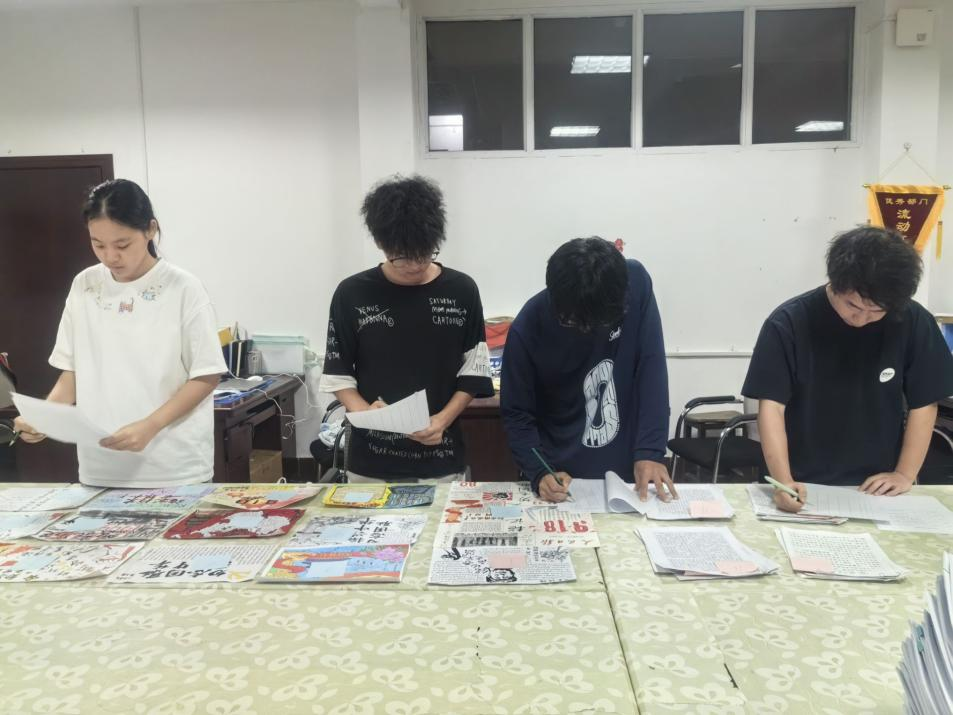 评审工作氛围初评和终评两个阶段,初评由六名学生代表组成评审小组,依据评分细则对参赛作品进行匿名评审,各筛选出20份优秀作品进入终评。终评由学生科副科长廖祥宇、学生科辅导员李子君等党团工作教师代表组成的评审组进行综合评审,从思想内涵、语言表达与创意设计等方面进行严格评审,最终评选出征文、手抄报两类作品的一、二、三等奖及优胜奖。