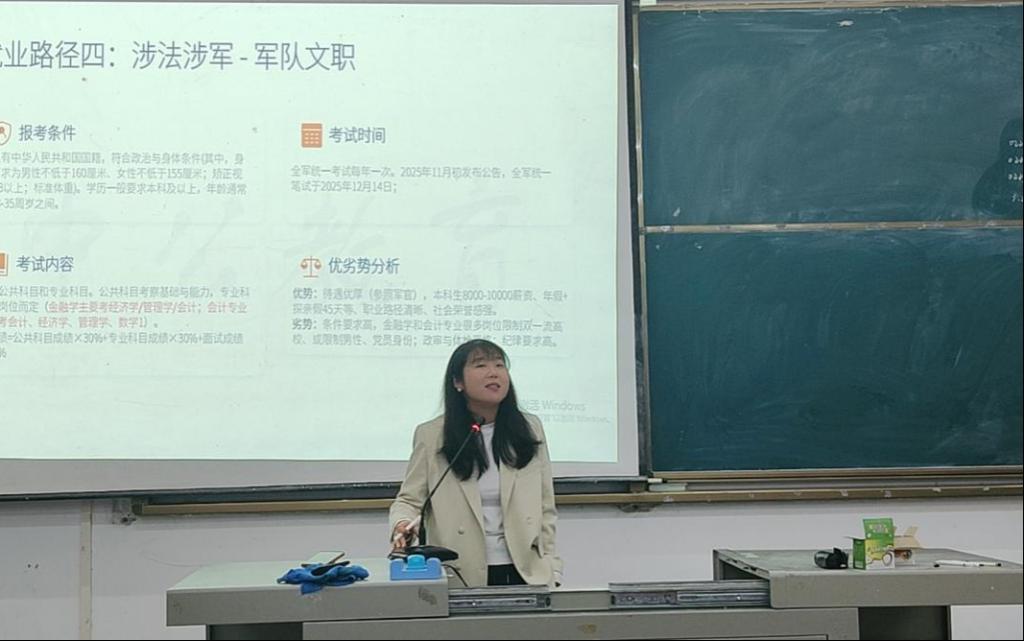 在就业方面,王静文围绕国家公务员考试、省考及选调生招录等内容,对报考条件、考试形式及岗位特点进行了说明,并结合数学类专业实际,介绍了税务系统、统计部门等岗位的基本情况。同时,她还对事业单位招聘、“三支一扶”、银行招聘等渠道的时间安排和备考要点进行了讲解,提醒同学们提前做好准备,合理安排学习计划。