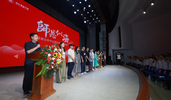 随后,开学典礼在雄壮的国歌声中正式开幕,师生齐声高唱,激昂旋律回荡全场,展现出深厚的家国情怀与昂扬的精神风貌。院长谷秋阳主持传统“拜师礼”环节。全体教师整齐登台,新生在台下庄重行礼。一鞠一躬之间,不仅承续了中华民族尊师重道的优良传统,也传递出新生对知识的渴求和对师者的敬仰,仪式温馨而庄重,寓意师道传承、薪火不息。