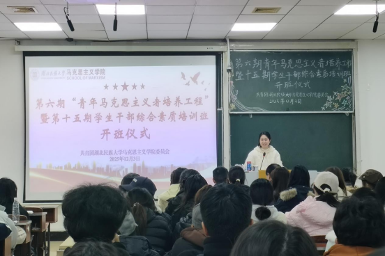 为深入学习贯彻党的二十届四中全会精神,引导青年学生骨干坚定理想信念、勇担时代使命,12月3日,我院在德智楼9B210教室举行第六期“青年马克思主义者培养工程”培训班暨第十五期学生干部综合素质培训班开班仪式。学院院长徐铜柱、党总支书记向驰、党总支副书记欧玲、学生科科长杨婷受邀出席,我院第六期青马班学员、2025级全体学生干部参与活动。仪式由我院团委副书记汪丽娟主持。