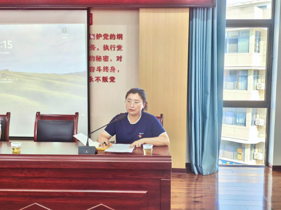 欧玲作宣讲开场和团队介绍。随后,2025年全国大学生“两弹一星”精神志愿宣讲团成员——湖北民族大学马克思主义学院“赤心铸红·芯星逐梦”志愿宣讲团以丰富的史实、生动的案例,为全体党员带来了以“中国共产党领导下的核工业”为主题的宣讲,宣讲团成员围绕“两弹一星”精神展开解读,结合中国核工业发展历程,深刻诠释了中国共产党人在其中彰显的坚定信念和无畏精神。