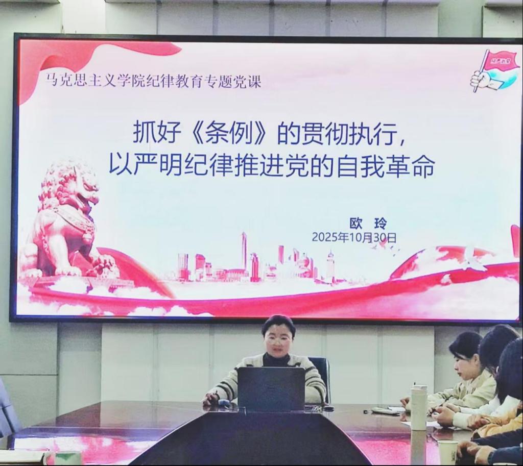 欧玲结合全会关于党的建设的要求,梳理学院廉洁风险点,强调思政教师需严守政治纪律、规范教学与生活言行,并部署党规党纪知识学习及考试工作。