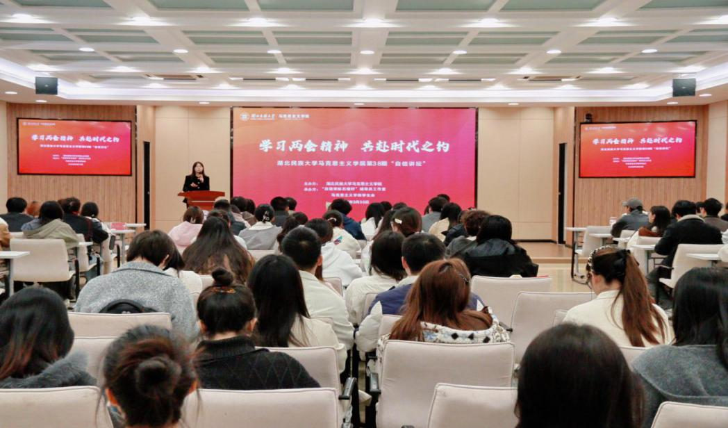 为深入学习贯彻2026年全国两会精神,引导青年学子将个人理想融入国家发展大局,厚植家国情怀、勇担时代使命,3月30日,湖北民族大学马克思主义学院第三十八期“自信讲坛”在德智楼三楼远程教学观摩室顺利举行。本期讲坛特邀第十四届全国人大代表、恩施高中思政课教师张琼丽担任主讲嘉宾,学校青马班学员、马克思主义学院学生代表到场聆听学习。