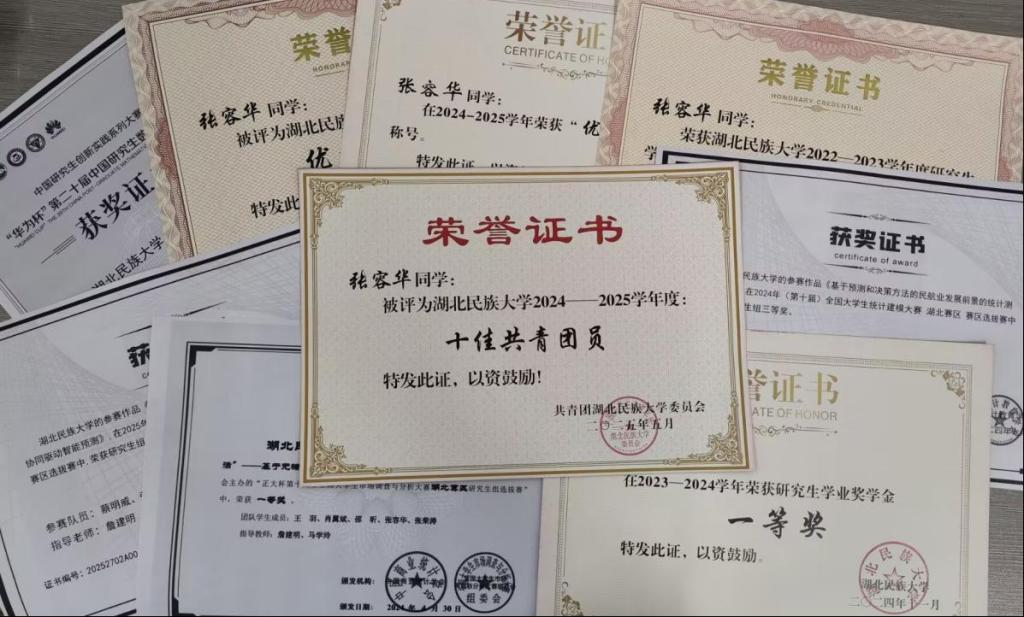 为全面提升专业能力,张容华研一时便跟随师兄师姐参与竞赛,并逐渐成长为团队核心。她在参与的6项学科赛事中屡获佳绩,但也曾经历过失败。团队在第二十一届中国研究生数学建模竞赛中曾因时间紧、任务重而失利,遗憾和自责情绪在团队中蔓延。但她坚信没有克服不了的困难,及时调整心态,迎难而上,与队友从赛题分析、主题确定到题目求解和文章撰写,每个环节精益求精,最终在第十五届全国大学生市场调查与分析大赛中荣获省级一等奖。不满足于现状、勇于突破的她,始终积极学习新知识,探索新领域。在跨领域参赛时,面对全新的知识体系,她总结出“抓住核心、快速迭代、边学边用”的高效学习方法,迅速将新知识转化为解决问题的能力。