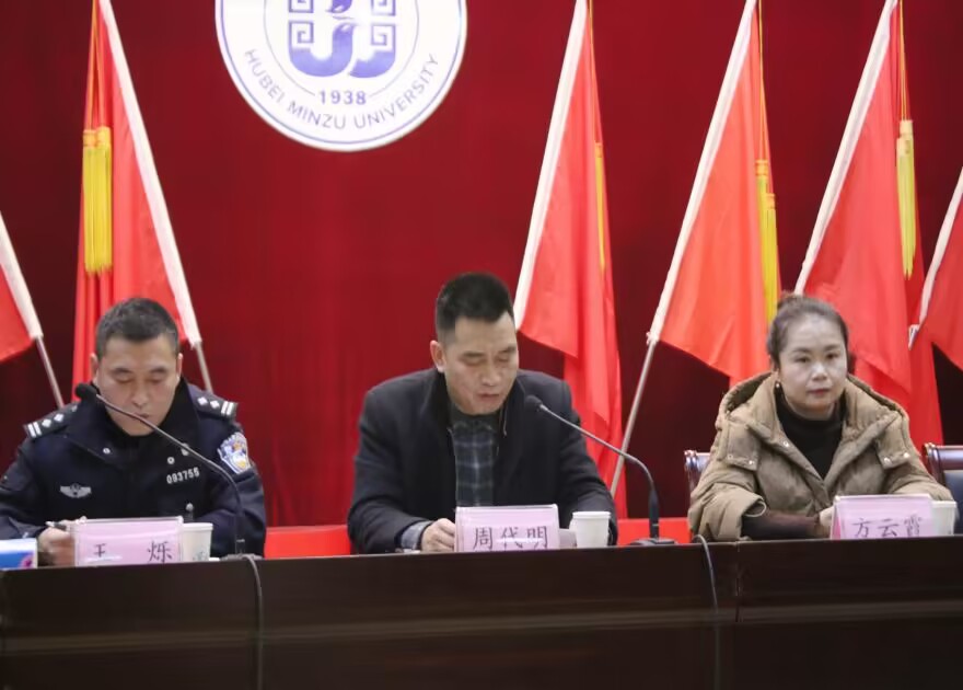 李建华宣读《湖北民族大学校卫队表彰文件》,方云霞、王烁等为彭生龙、黄杨洋等荣获“平安校园建设学生标兵”和“优秀学生干部”称号的同学颁奖。随后,李建华宣读《湖北民族大学第二十七届校卫队成立文件》,宣布新一届校卫队任职情况,任命黄杨洋为第二十七届校卫队队长,魏融、邓昶为指导员。