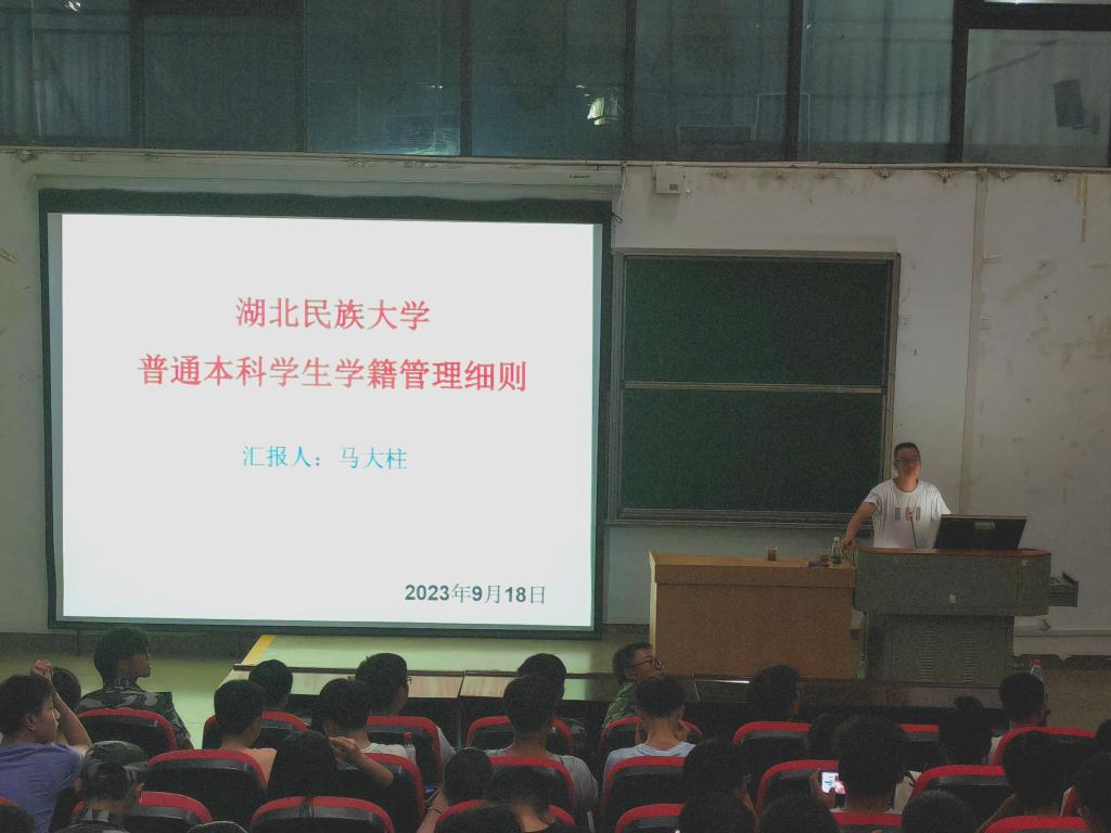 为提高新生对于我校学生管理细则的认知程度,9月18日晚,我院于修远楼5B509教室举办“湖北民族大学学生学籍管理管理细则”专题知识讲座。本次讲座由我院教学管理办公室马大柱主任主讲,我院2023级全体新生参加此次讲座。