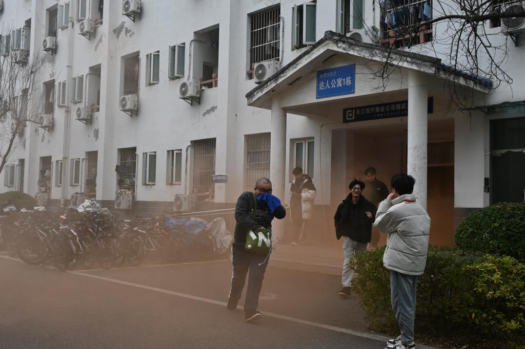 14:30,演练正式启动。随着火灾报警声响起,达人1栋门口迅速释放模拟烟雾,模拟真实火情场景。疏散引导组工作人员立即到位,按照预定方案有序引导楼内学生用湿毛巾捂住口鼻,采取弯腰低姿的正确姿势,沿疏散通道快速、有序撤离至修院楼A区前方空地安全区域。整个疏散过程紧张有序,师生响应迅速,未出现拥挤、慌乱等情况,充分展现了前期培训与筹备的成效。