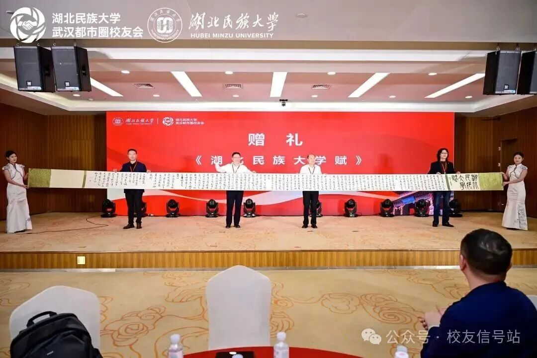 情深反哺,意切桑梓。校友会特请会长、毕上教育科技有限公司董事长夏晓华和执行会长、湖北省写作学会副会长、今古传奇杂志社社长总编辑杨如风向母校湖北民族大学赠送了独具意义的《湖北民族大学赋》,这幅十米卷轴由校友会邀请著名青年书法家黄无可书写,表达了武汉都市圈全体校友对母校培育之恩的深深感激与诚挚祝福。