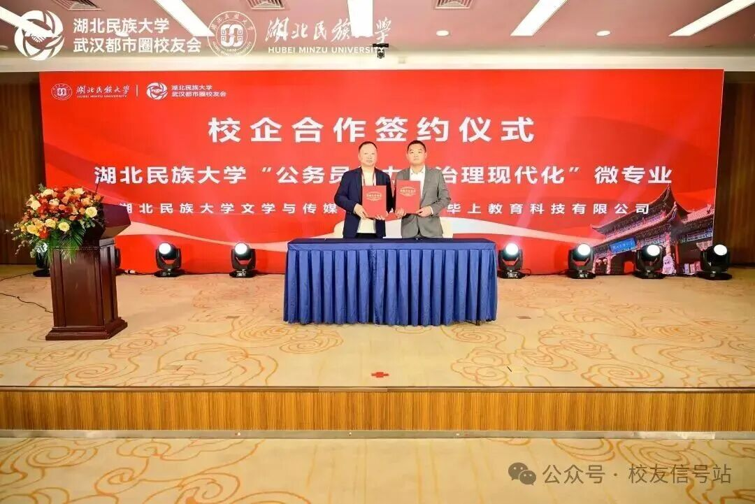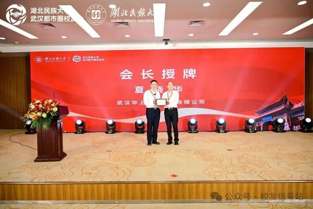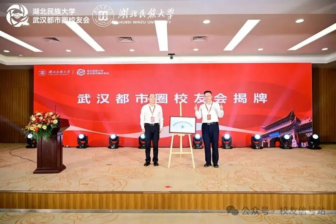 在全体校友的见证下,大会迎来了系列激动人心的仪式环节。首先进行的是揭牌仪式,由湖北民族大学党委常委、副校长李军和武汉毕上教育科技有限公司董事长夏晓华共同为湖北民族大学武汉都市圈校友会揭牌,标志着新一届理事会工作的正式启航。