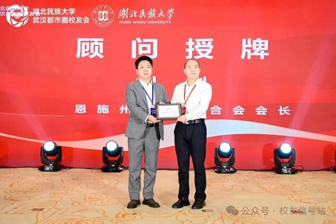 每一块牌匾,不仅是一份荣光,更是一份沉甸甸的责任与担当。大会同时为特聘顾问、恩施州楚商联合会会长刘刚授牌,旨在汇聚前辈智慧,融通各界资源,为校友会发展保驾护航。