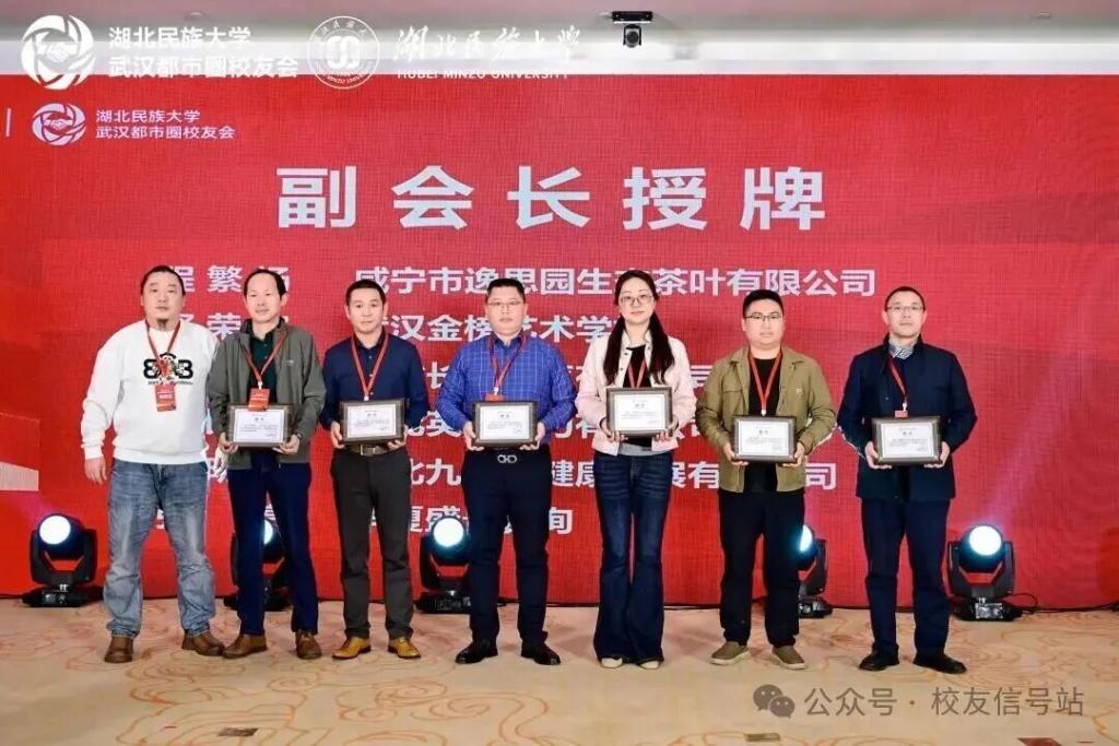 湖北民族大学招生就业与校友联络处副处长杜锐为新当选的副会长程繁杨、舒荣安、毛军、解国仑、张明进、张婷授牌。