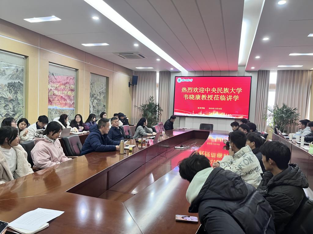 20251210,体育学院于德智楼A栋三楼会议室举办题为“体育非物质文化遗产研究中的科研方法运用”的学术讲座。本次讲座邀请中央民族大学的韦晓康教授作为主讲嘉宾,会议由体育学院副院长胡庆华主持,学院师生参加会议