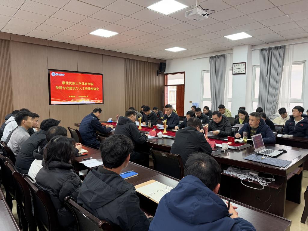座谈会上,何斌院长对各位专家的到来表示热烈欢迎和衷心感谢,他详细汇报了湖民族大学体育学院学科发展规划、专业建设现状、人才培养体系、师资队伍建设及科研工作进展,重点介绍了民族传统体育特色培育、师范专业认证、一流专业建设等方面的工作思路与实际成效,并就当前学科提升、人才培养优化等方面遇到的问题与困惑进行了汇报。