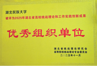 大会表彰了2025年湖北省高校统战理论研究工作优秀成果和优秀组织单位。我校统战理论研究工作再创新高,再次荣获“优秀组织单位”;共有7篇统战理论研究成果获奖,其中,王庆贺《互嵌互惠、共享共生与共情:都市民族团结进步创建的目标向度》获一等奖;向驰、韩美群《中华体育精神融入高校铸牢中华民族共同体意识教育的逻辑、意义与实践进路》,鲁帅、祝家瑞《三维数智统战能力:技术适配、制度弹性与人文温度》获二等奖;胡兆义《互嵌共生:多民族交融发展的武陵实践》、吴昶《族际交融与洗车河流域西兰卡普文化生境的变迁研究》获三等奖;钱楷《族际交融与洗车河流域西兰卡普文化生境的变迁研究》、白松强《强化文化认同与实践育人 民族高校铸牢中华民族共同体意识的理论逻辑和实践路径》获优秀奖。