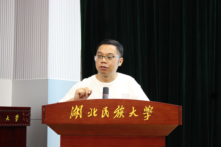 陈云豪着重介绍了语言学相关专业的教学安排与课程设置。他聚焦语言学板块,强调坚守人文情怀的重要性,引导学生树立提升专业能力与师德情怀的意识。同时,他引导学生树立提升专业能力与师德情怀意识,警惕人工智能和短视频等对自主思考与专注力的负面影响。最后,他通过分享《孟子·尽心上》中的经典名句对新生寄予厚望,并倡导学生在日常生活与学习中多读多写,涵养学术素养。