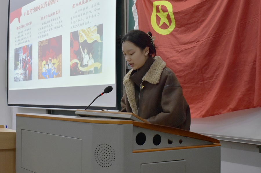在“领会全会精神,把握时代背景”主题下,主持人通过播放“青春赋能强国”主题短片,围绕习近平总书记在党的二十届四中全会上的重要讲话,带领学生学习全会精神的核心内容,明确新时代青年的成长方向。在“聚焦规划要点,明晰部署方向”主题下,主持人以习近平总书记阐述的七个关键问题为先导,介绍党在推动高质量发展的阶段下,做强国内大循环、畅通国内国际双循环等方面的政策要领,引发学生深刻思考。在“践行青春使命,助力征程起航”环节,匡代鑫和刘一墁同学围绕科技自立、民生温度等主题通过具体事例阐释政策方针。随后,学生别梦琪、何亚洲带来以“青春颂全会 同心筑家国”为主题的朗诵,在文字与感情的碰撞中展现青春担当。