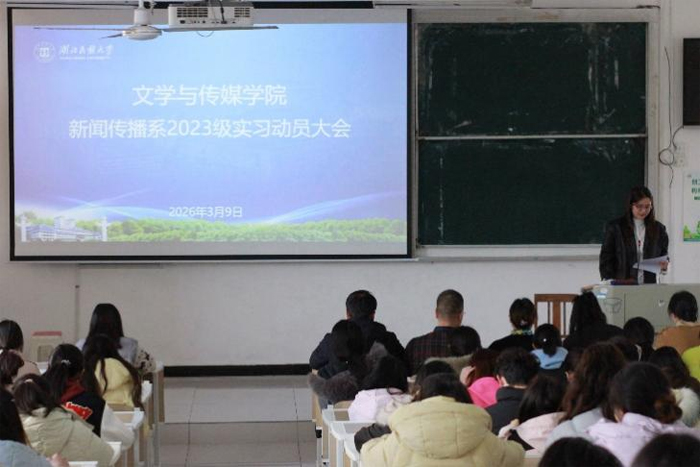本网讯(通讯员 黄婷婷) 3月9日下午,文学与传媒学院新闻传播系2023级本科生实习动员大会在附102教室召开。学院副院长江佳慧,新闻传播系副主任谭苏、吴龙胜,教学科与学生科相关工作人员,2023级新闻学、编辑出版学专业班主任及全体学生参加会议。会议由谭苏主持。会上,教学科科长张慧围绕本次实...