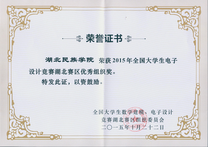 全国大学生电子设计竞赛是教育部倡导的大学生学科竞赛之一,面向大学生的群众性科技活动,目的在于推动高等学校促进信息与电子类学科课程体系和课程内容的改革。竞赛的特点是与高等学校相关专业的课程体系和课程内容改革密切结合,以推动其课程教学、教学改革和实验室建设工作,有助于学生工程实践素质的培养、提高学生针对实际问题进行电子设计制作的能力;有助于吸引、鼓励广大青年学生踊跃参加课外科技活动,为优秀人才的脱颖而出创造条件。自2001年开始由信息工程学院选拔学生进行培训代表我校第一次参加该项赛事以来,获得了国家二等奖、湖北省特等奖、一、二、三等奖及优胜奖等各类奖项共计100余项。