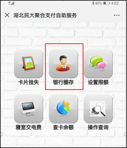 2、 手机端圈存方法: 扫描以下二维码关注 “湖北民族大学”微信公众号,关注成功后进入公众号,点击右下角“更多精彩→ 一卡通→银行圈存”即可使用校园卡银行圈存功能。