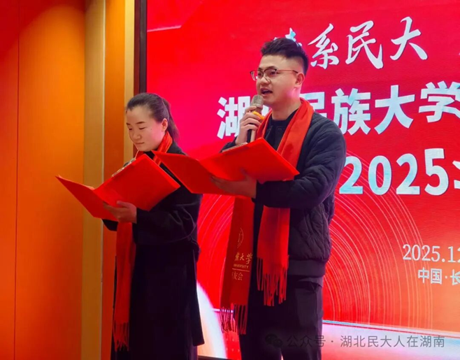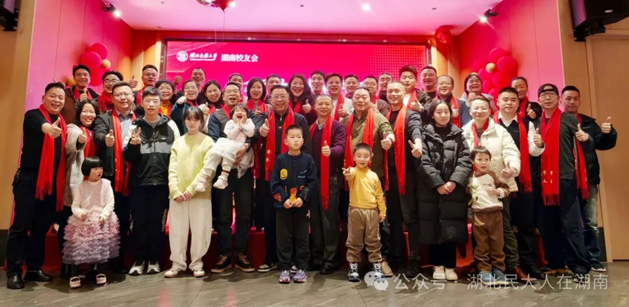 冬日长沙,暖意融融。2025年12月27日,以“情系民大 湘聚同行”为主题的湖北民族大学湖南校友会年会在长沙隆重举行。湖北民族大学招生就业与校友联络处副处长杜锐、美术与设计学院党总支副书记向贤海、招生就业与校友联络处原处长向政等以及30余名湖南籍校友齐聚一堂,共叙民大同窗情谊,共话湘地发展机遇,现场氛围热烈而温馨。