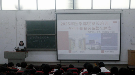 本网讯 (记者 文雅圆/文 李江洁/摄 通讯员 黄顺/摄)11月25日,医学部公寓管理委员会于修远楼5B508、5B509教室召开22级、23级、24级和25级寝室长培训会议,会议由医学部学生工作办公室钟迪颖老师和谭雯心老师主讲。